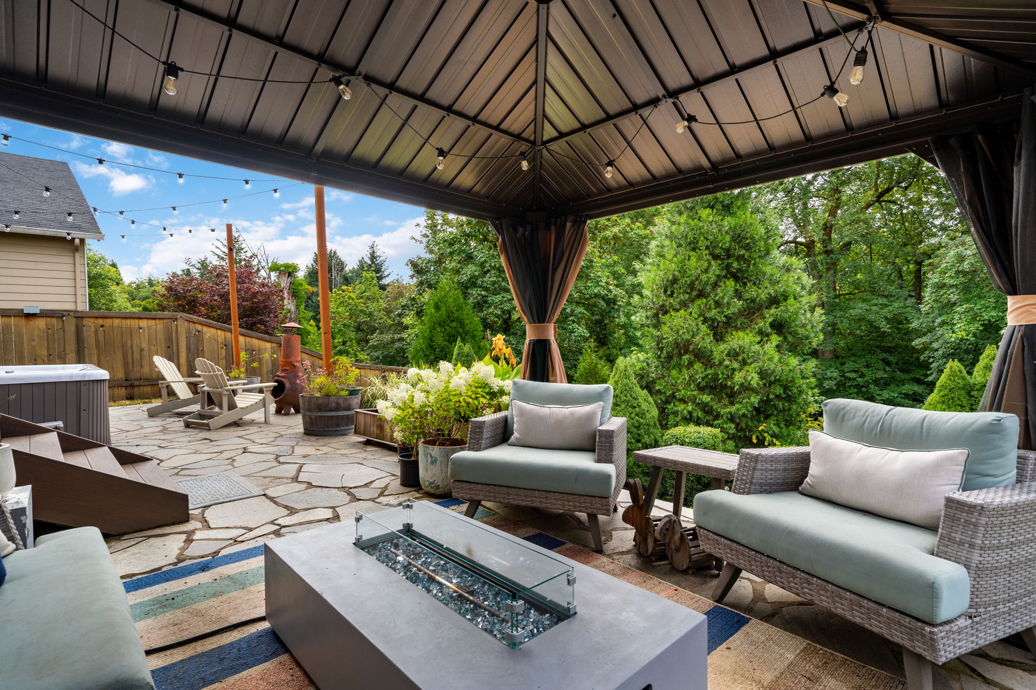 The primary suite takes full advantage of these views and also features laminate wood flooring, a walk-in closet, soaking tub, double sinks, and walk-in shower. The backyard oasis includes a covered gazebo, hot tub, and views that must be enjoyed with your morning cup of coffee in hand - or by the fire pit in the evening.