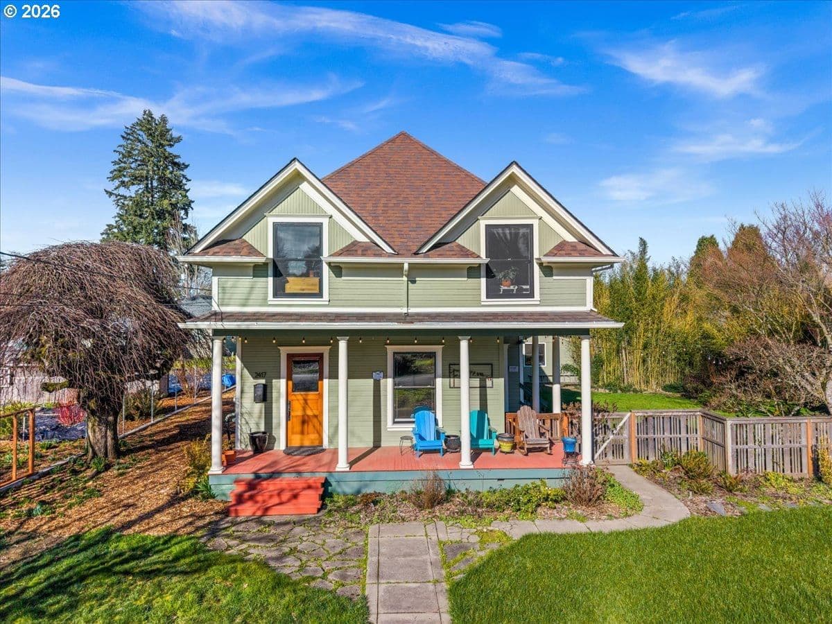 Open House Saturday and Sunday 12-2pm! Step into timeless charm with this captivating 1907 farmhouse that blends vintage character with modern flair. A sweeping covered front porch welcomes you home, wrapping gracefully to the dining area—perfect for morning coffee or sunset gatherings. Inside, soaring ceilings and a gallery-style hallway set the stage for your favorite artwork, highlighted by a stunning stained-glass window and an elegant open wooden staircase. The formal living and dining rooms impress with wood-wrapped picture windows, exposed beams, and beautiful natural light that creates a warm, inviting ambiance. The cozy family room offers plush comfort with sunny windows that bring the outdoors in—hardwoods waiting beneath the carpet. At the heart of the home, the chef’s kitchen dazzles with quartz countertops, subway tile backsplash, copper sink, stainless steel appliances, glass-front cabinetry, and a movable island with breakfast bar seating. A spacious mudroom provides abundant storage and a deep utility sink—ideal after gardening or outdoor adventures. Main floor office boasts a bright window and a half bath with pocket door. Upstairs, an open loft offers the perfect flex space for relaxing or movie nights, plus a convenient laundry closet with built-ins (washer and dryer included).The primary suite features designer paint, built-ins, a generous closet, and room for a sitting area retreat. Three additional spacious bedrooms boast excellent storage, charming built-ins, and brand-new carpet. Outside, enjoy a fully fenced yard bursting with blooms, paver patio space for outdoor dining or a firepit, and a delightful garden shed. With a two-car attached garage, an additional detached garage, and a location within walking distance to Rogers Park—and just 15 minutes to Hagg Lake—this home offers character, comfort, and convenience in one unforgettable package.