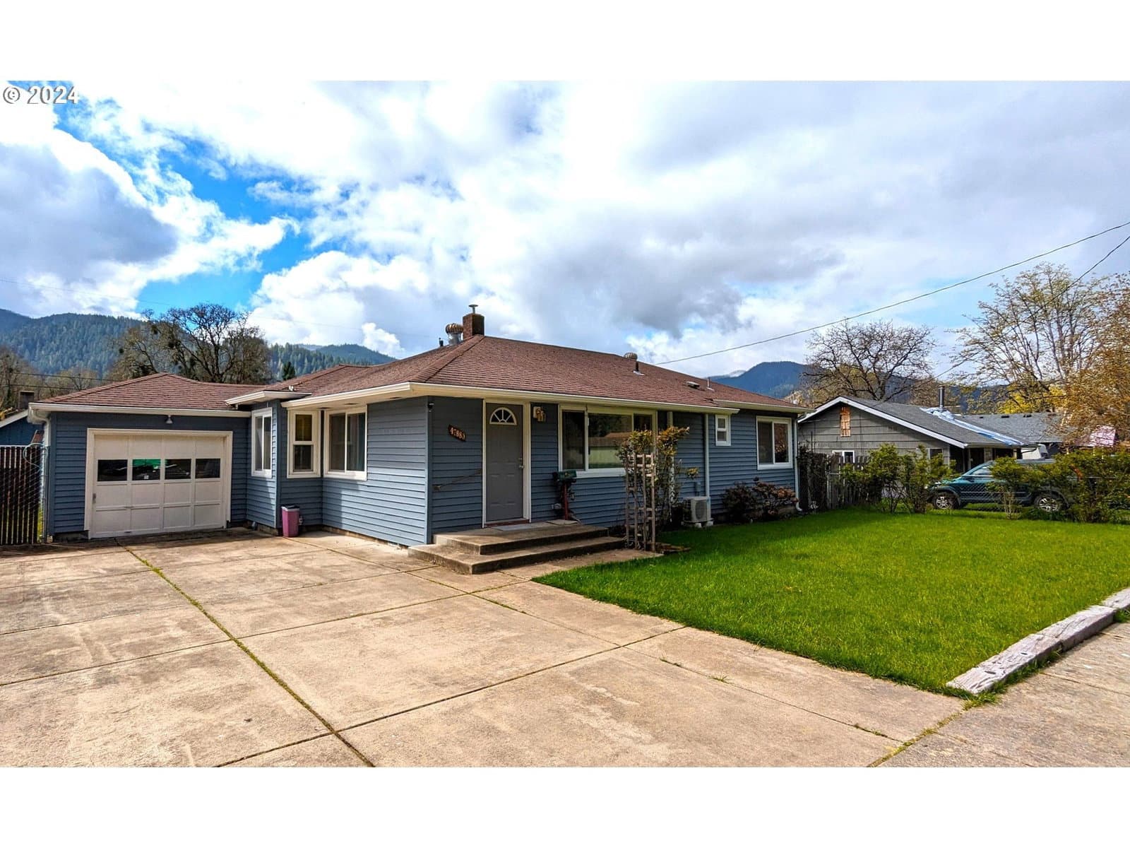 Very sweet, ranch-style cottage near the heart of Oakridge. No neighbors across the street! Updated flooring includes laminate and slate. Vintage kitchen includes all appliances (fridge, micro, range, washer/dryer). Tons of storage and custom built-in drawers/cupboards in every room. Vinyl, insulated windows, pellet stove and ductless heat pump. Laundry/mud room opens to enclosed, concrete patio. Fenced backyard with raised beds, fruit trees, and metal tool shed. Detached workshop (more built-ins!) with attic storage. Backyard is fully fenced with alley access and rolling gate. Generous, concrete pad w metal frame for covered parking or RV/boat storage. There's much more than meets the eye on this one!