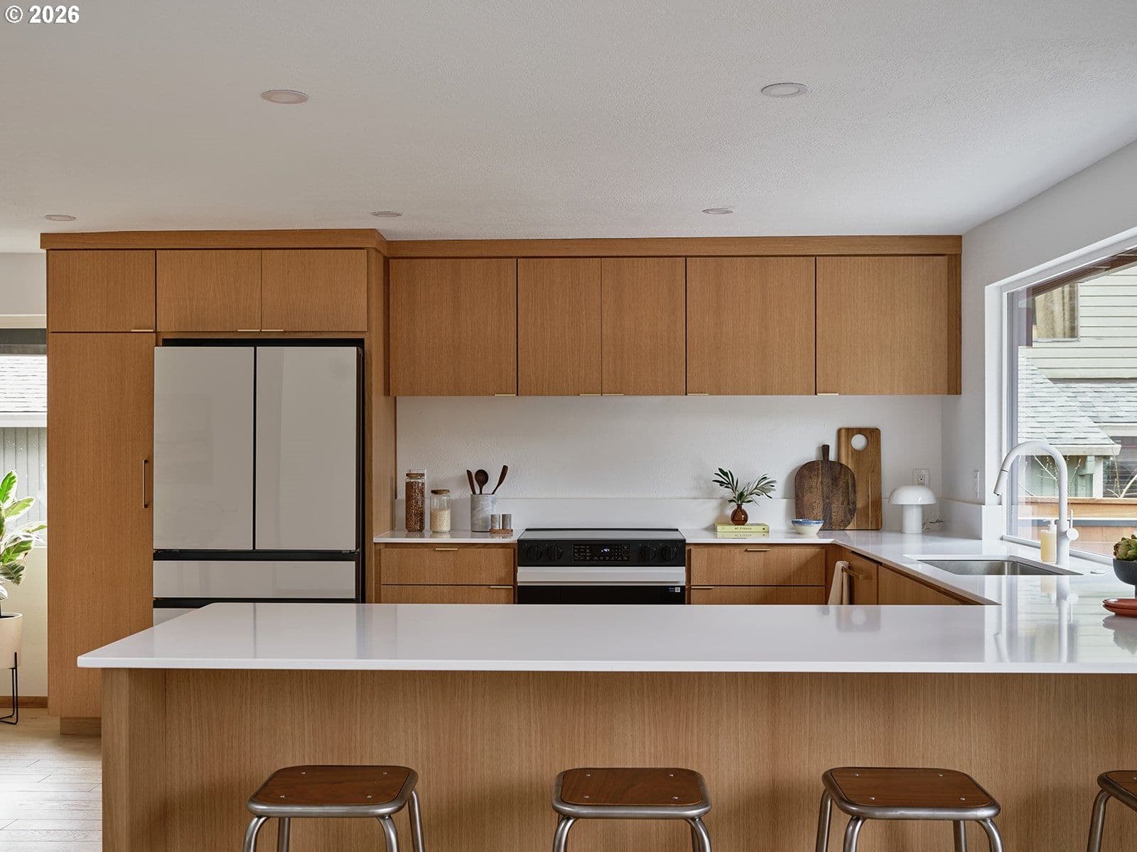 This one is straight out of Dwell Magazine. A truly special mid-century modern retreat that lives large, light, and effortlessly functional; all on one level. Vaulted ceilings stretch across the main living spaces, while multiple skylights wash the home in soft, natural light from morning to evening. New windows sharpen the clean lines and brighten every corner, making the entire home feel open, calm, and expansive.At the heart of it all is a thoughtfully updated kitchen, featuring custom white oak cabinetry, modern appliances, and a warm palette that pairs beautifully with the white oak engineered hardwood floors throughout. The layout is generous and intentional—every room feels oversized, from the wide living areas to the large bedrooms that offer space to breathe, work, rest, and truly settle in.The primary suite is impressively large, designed to feel like its own private wing. In the primary bath, designer tile, a spacious shower, and elevated finishes deliver a clean, spa-like experience that feels straight out of a design spread. A large laundry room and an oversized garage round out the home’s everyday practicality—without sacrificing style.Anchoring the living room is an original stone fireplace, a timeless nod to the home’s mid-century roots. And outside, the setting matches the interior vibe: a quiet, peaceful neighborhood that feels tucked away, yet connected.With a brand-new roof, curated updates, and design-forward details reminiscent of Herman Miller and Rejuvenation, this home is the rare combination of architectural charm and modern ease—ready to impress from the first step inside.