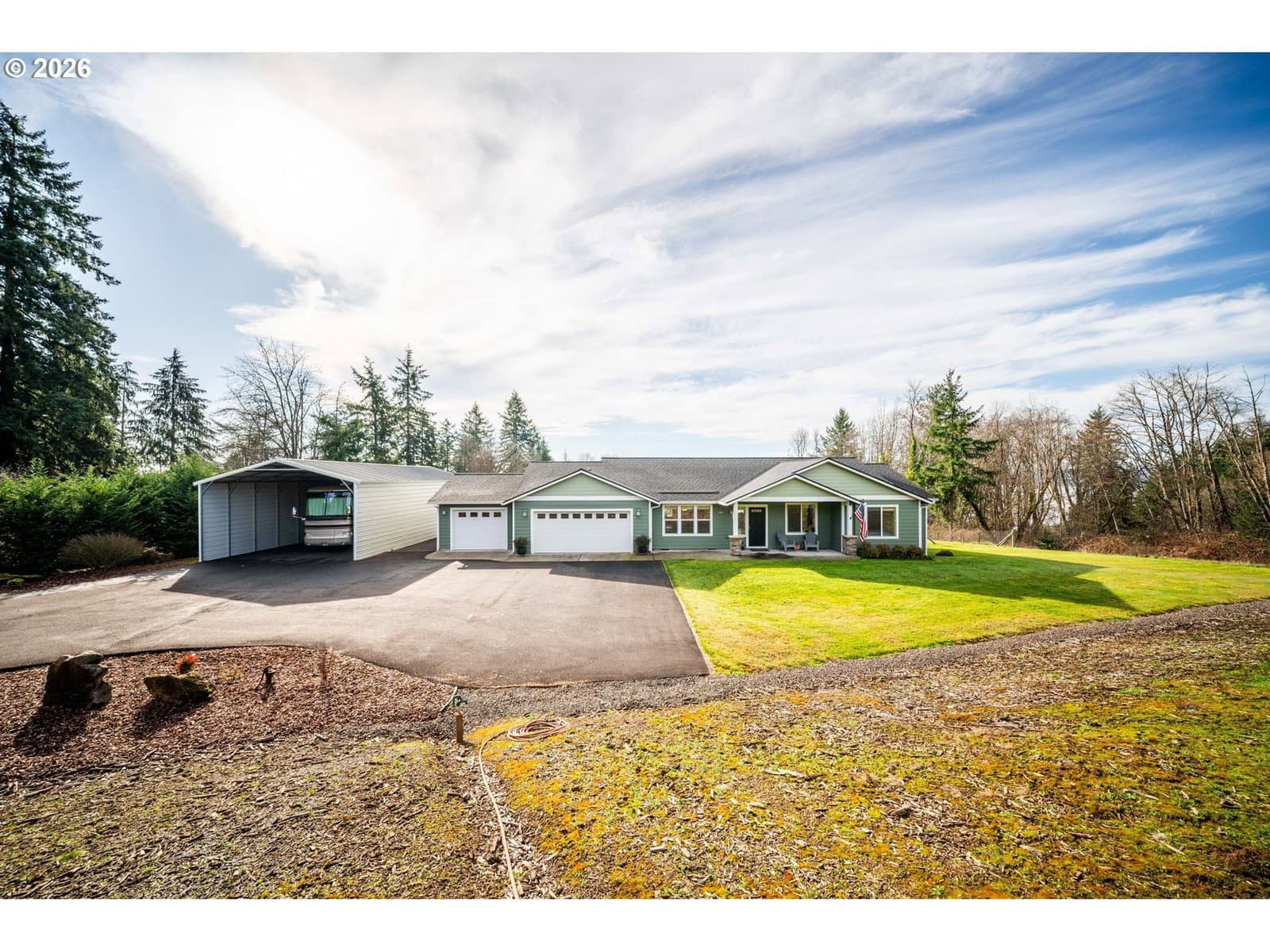 Discover this beautifully maintained single-story home on ~2.67 acres overlooking the Columbia River in the lovely community of Kalama! Step inside to find high ceilings, a spacious dining room and kitchen with granite countertops, stainless appliances, and a corner pantry — perfect for entertaining or comfortable everyday living. Pride of ownership shines throughout with thoughtful finishes, manicured landscaping, and a warm, inviting feel. The home offers a finished 3-car garage with built-in cabinets and custom workshop space, plus an impressive 25x50 detached metal shop with pavement under providing ample space for your boat, tractor, RV, or toys! Outside you'll enjoy loads of paved parking, a stone-accented covered porch entry, a fenced yard, and a covered back deck ideal for relaxing while taking in the view. The property also includes a charming old homestead structure —currently used for storage — with a rustic sauna inside, and three driveway approaches for convenient access. With city water and septic, PLUS a private well for irrigation, this home blends comfort and practicality. A 50-year roof adds peace of mind, and the location offers the perfect balance of privacy and convenience — just minutes from town and freeway access. A rare find combining space, views, and a one-level layout that you don't want to miss!
