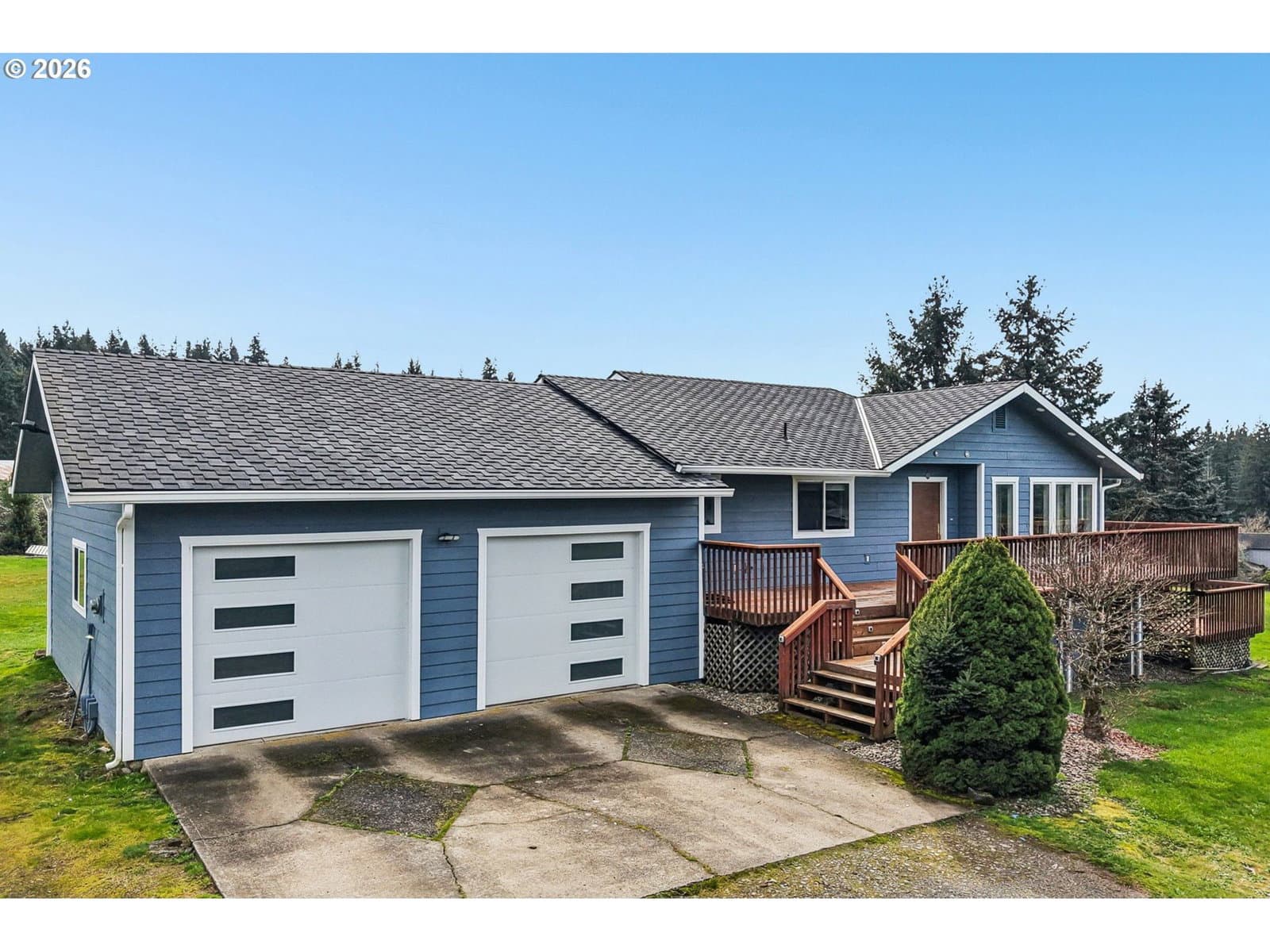Beautifully designed home with exceptional space both inside and out. Ideal horse property, including 2 tax lots totaling 7.43 acres. Welcoming wrap-around deck opens to great room family room, windows frame sweeping territorial views of surrounding property, sliding door access to covered deck, creating seamless indoor-outdoor living. Gourmet stainless kitchen well-appointed with some Dacor appliances. Granite countertops and marble tile backsplash complement abundant shaker-style soft-close cabinetry, some with glass panes and pull-outs, plus open shelving. Adjacent to kitchen is the dining area. Main-level primary en-suite offers deck access, and spacious walk-in closet with California Closet organizer. Luxurious bath includes a dual vessel sink granite floating vanity, frameless shower with marble tile up to ceiling, private water closet. Second bedroom and full bath are also located on the main. Lower level expands living space with two additional bedrooms, fifth non-conforming bedroom ideal for media room/office, huge bonus room pre-plumbed for wet bar, abundant windows with territorial views and slider access to covered patio. Additional conveniences include 2 laundry rooms, one fully equipped on the main with built-ins and granite counters, another on lower level pre-plumbed with washer and dryer. Interior highlights: All appliances remain, floating vanities in all bathrooms, granite countertops, hardwood, marble tile and carpet flooring, recessed lighting, 80-gal hot water heater. Hughes Network internet available. Outdoor amenities: wrap-around deck, covered patio, oversized two-car garage, new Hardi Plank siding, new 50-year roof. Substantial shop of approx 1800 sq ft plus a 300 sq ft loft, electricity, security lighting, concrete floor, two tall garage doors, and mechanics service pit. 30x60 pole barn, electricity, security lighting, previously housed five stalls. Four cross-fenced pastures. Mortgage savings may be available for buyers of this listing.