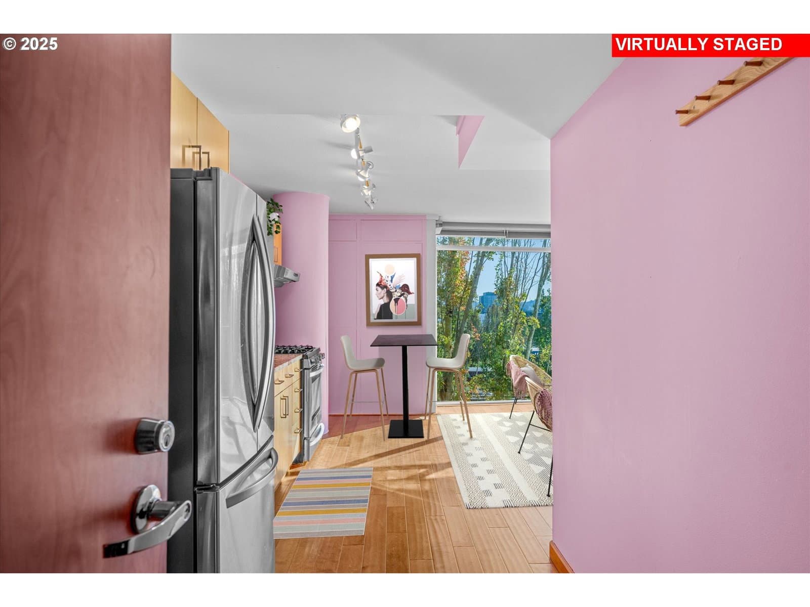 If beige walls make you yawn, you are about to feel very seen.This condo understood the assignment and chose joy.This 1 bed, 1 bath, 6th floor condo is pure Barbie Boho Chic meets Keep Portland Weird. It is playful, confident, and completely unbothered by anyone’s strong opinions about accent walls. Neutral lovers, don’t panic. Yes, it can be painted back if that is your journey. But while it is living its best life, this condo proudly shows up in bold, joyful color because here, neutral is just another word for not today. And honestly, you do you boo.Sunlight pours through floor to ceiling windows, bouncing off engineered hardwood floors and lighting up postcard worthy views of the Oregon Convention Center spires & the Downtown Portland skyline. It is bright, cheerful, and somehow manages to feel cozy & energizing at the same time, like a really good playlist.The open concept layout flows seamlessly from a modern kitchen with stainless steel appliances & maple cabinetry into a living space that works just as well for slow Sunday coffee rituals as it does for impromptu dance parties when your favorite song hits. Don’t worry, the neighbors get it.Step outside to your private patio complete with a doggie door because yes, this condo is dog friendly and your furry roommate deserves city view sunbathing too. Add in an in unit washer & dryer & you can officially retire from hauling laundry down mysterious hallways into basement rooms that feel like a dungeon. Growth.The building also offers a 2nd floor garden deck with a grill & patio seating, perfect for summer BBQs, & casual hangsAnd then there is the location. With 5 different modes of public transportation right outside your front door, the Moda Center just down the street, & coffee shops, breweries, and food carts everywhere you turn, this condo delivers Peak Portland living without even trying. It is a color soaked love letter to a city that refuses to be ordinary.