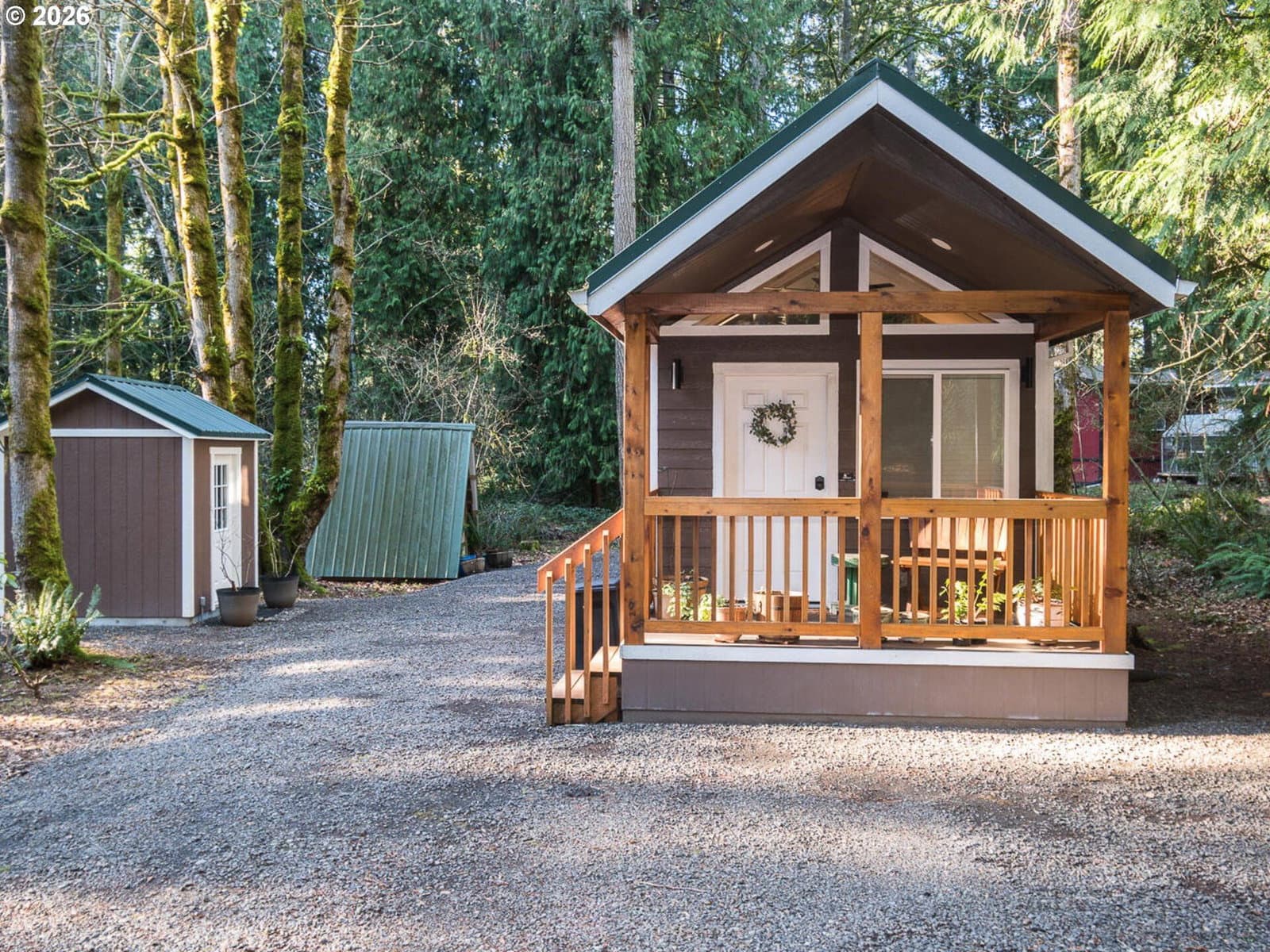 Built in 2022, this custom park model home offers thoughtful upgrades and a warm, cabin-style feel in a serene, forest-like setting—close to the city, yet far enough away to enjoy true tranquility. Natural pine interior walls create an inviting atmosphere to match the forest view when you look out the windows. The full kitchen features all full-size stainless steel GE appliances, including a gas range, large refrigerator with ice and water, dishwasher, island, and a stainless steel apron sink. Separate living and dining areas provide comfortable and functional spaces, with ample storage thoughtfully integrated throughout the home. A spacious loft offers flexible use as an additional sleeping area or bonus space and is not included in the listed square footage. Additional features include a mini-split heating and cooling system, rain gutters with gutter guards, and 50-amp electrical service. Step outside onto the large front deck, take a seat, relax, and enjoy the great outdoors surrounded by lush greenery. The home sits on a generously sized lot and includes a 2024-built 8x8 Tuff Shed, fully insulated with a 30 amp electrical providing power, featuring white shiplap interior—perfect for storage, a workshop, or a private office away from the main home. This property delivers comfort, efficiency, and charm. From the moment you walk in.